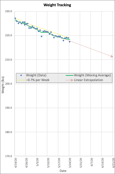 But, over the course of 24 hours I dropped 1.7 lbs. (Yes, I know it’s not all fat, but it still made me feel good.) Looking at my weight tracking (yes, it’s Excel, don’t hate me), based on that first day’s measurement and losing 0.7% bodyweight per week, I’m also still a bit ahead of my goal. Yes, the four-week linear extrapolation still doesn’t have me below 210 lbs (how friggin’ long does it take?!) but 0.7% loss is still a bit aggressive, so at least it’s going down, and slightly ahead of schedule, and definitely it’s not going up.