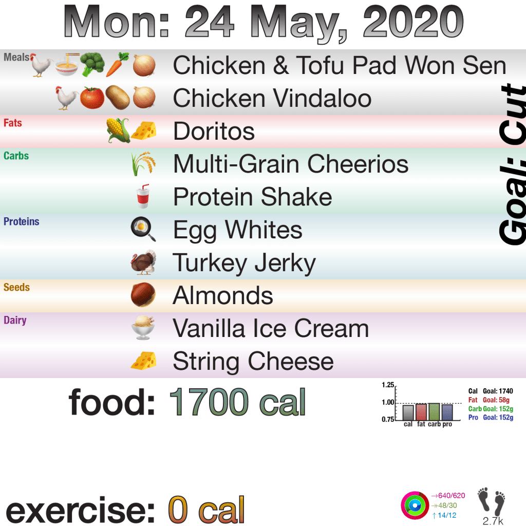 I’m a day late with this but the reason is I kinda felt like crap for the latter half of yesterday. Mid-afternoon I got a headache and despite laying down for two hours, it remained. I recognized it as a dehydration headache, so I drank a lot yesterday afternoon and evening, but I didn’t feel okay again until after midnight. Hence, no exercise (but chasing chickens filled the rings … yes I lowered the move ring to my old standard). Still managed to fit in my food goals, though. And, let’s just say that the frequent 🚽 trips allowed me to stay on track with weight, only going up 0.3 lbs from Monday to Tuesday.