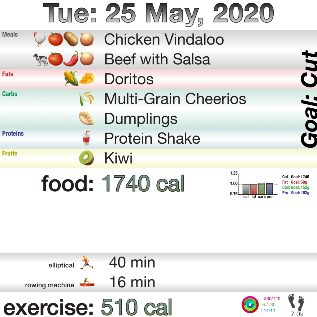 So anyway, food today was a lot of dumplings. Two kinds, twice. I need to be a bit more careful when I do my meal planning. The issue was the confluence of chicken vindaloo and the beef with salsa on the same day, both being very low-carb meals: Combined, 50.1 gms of carbs, while my goal is 152.2 gms. So, back-and-forth tweaking the plan over the last few weeks, as I moved things around, it looks like I thought at one point, “Dumplings are my go-to of some carbs, fairly low fat, and a bit of protein,” so I put it in the plan for today. Then I likely shifted something in or out and looked at the macros and thought, “Hmm, I have ~30 more carbs to play with, let’s put in some dumplings, those are good!” So, yeah.