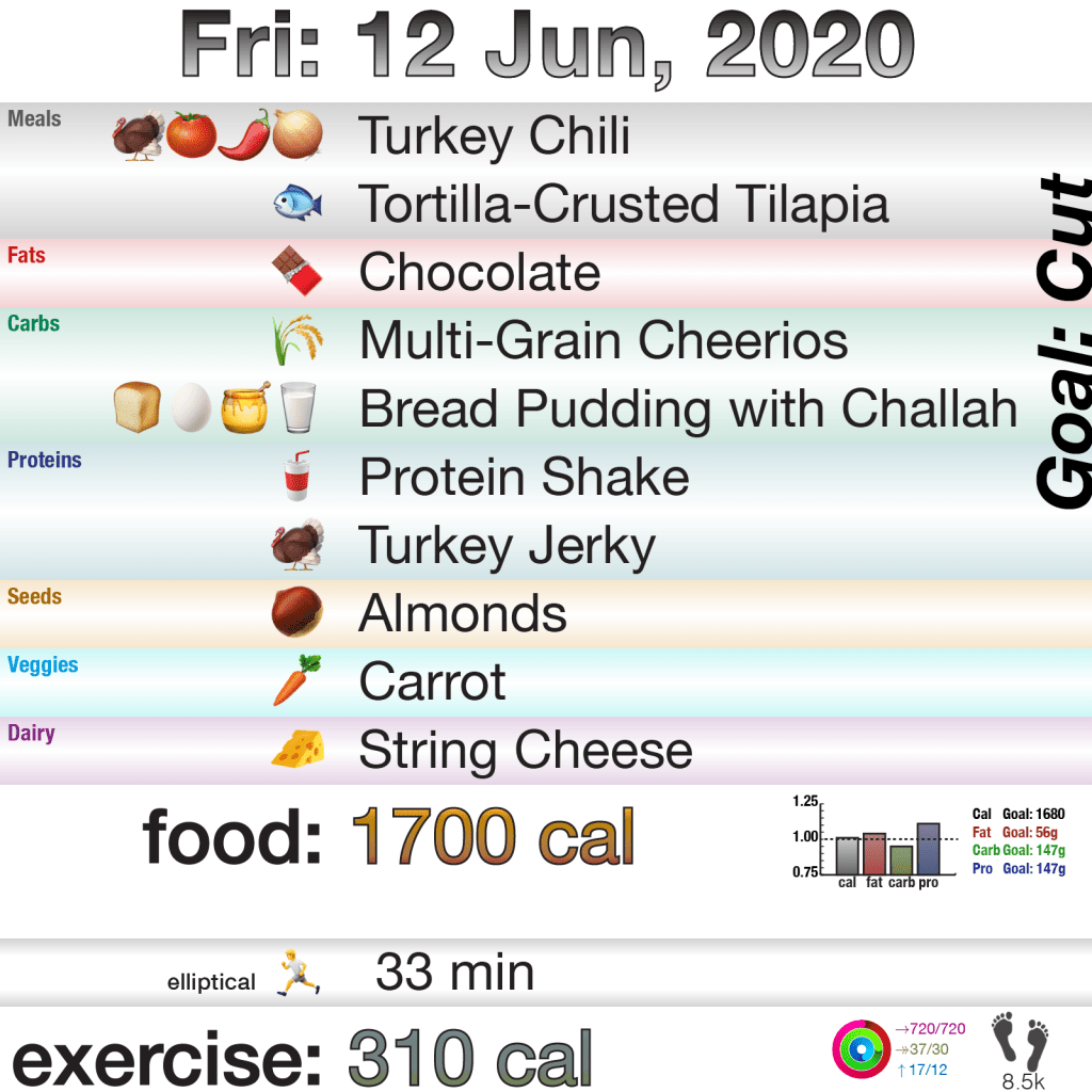 So, let’s get food out of the way first: I was within 5% of my goal on calories and fat, under on carbs, over on protein. So, that’s good. The slight imbalance is to get me good on the week, given the baking I did on Wednesday. So, all good there, still on track to be within 2% of everything on the week’s end.