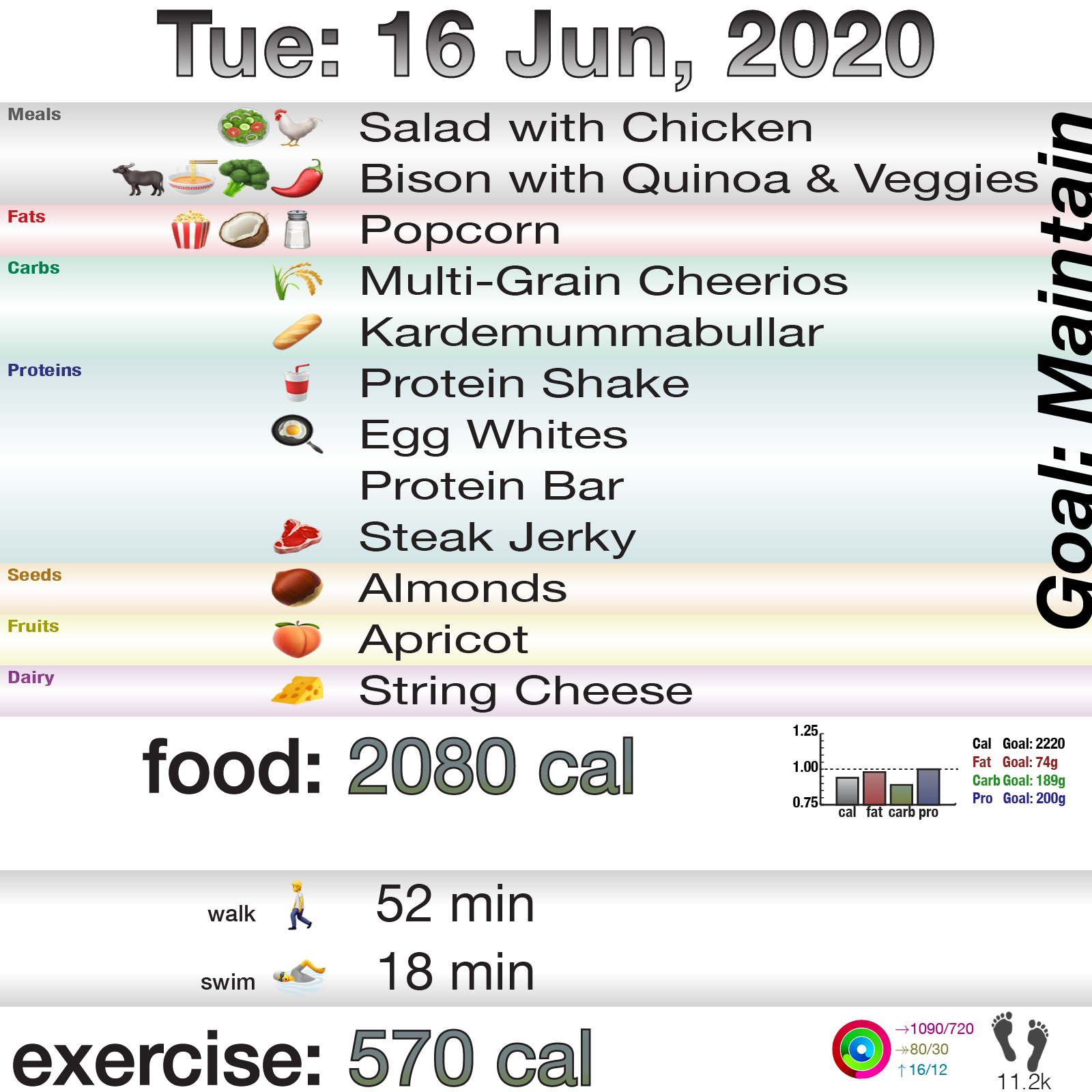 Second day at my parents’ house, and I again was fairly good with calories, still under the 2220 goal, but percentage from protein was higher than from fats and carbs. Again a large variety of food to try to meet that protein percentage, so I had to shrink the food bars in the infographic because …