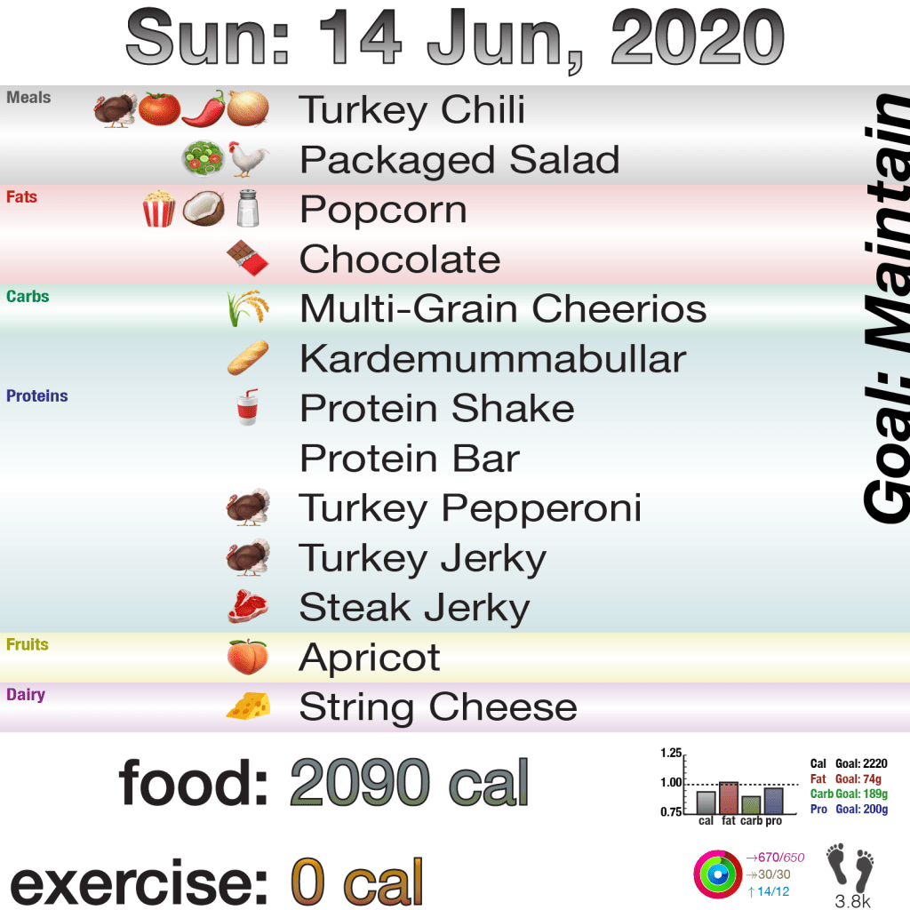 So, first up is the driving day, Sunday June 14. I packed and then left the house at 11am, getting to my parents 18 hrs later at 7am (+2 hr time zone change). The many different foods in the infographic are because I’m now in “maintenance” mode for a week, with increased calories and zero weight-loss goal, but I still need to hit a roughly 30.0% / 34.1% / 35.9% fat/carb/protein split. So instead of just eating Doritos® during the entire drive, I needed to eat lots of protein. Which was not hard because there was very little else to do during the drive. I had originally planned on exercising for a half hour before leaving in the morning, but, that didn’t happen at all.