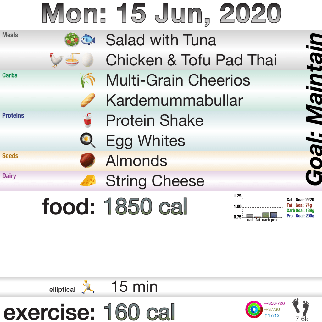 So … going from 1680 cal/day to 2220 cal/day while maintaining a high protein intake is not easy. I was forcing myself to eat, so at some point I just said “screw it” and treated the 2220 cal/day as a max, but so long as I hit the macros, then it was okay to be under. So, it was an 1850-calorie day. While maintaining the macros.