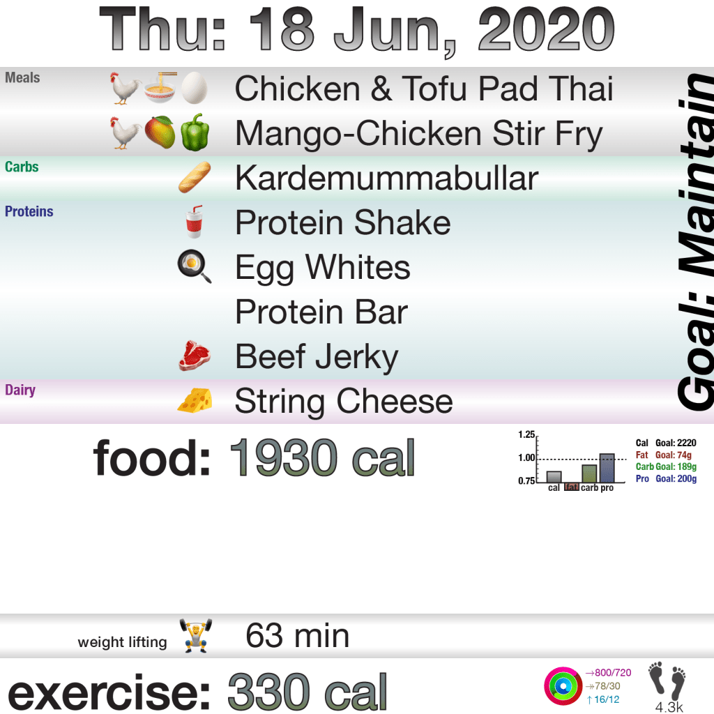 So, let’s get this over with. Food. I kept calories lower than I allegedly need for maintenance and focused on getting a lot of protein. So, that went well.