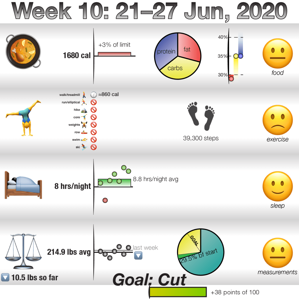 Points: I got the second-lowest points this week, coming in at +38, only higher than Week 01 at +31. Points were low because of failure to do much of any exercise.