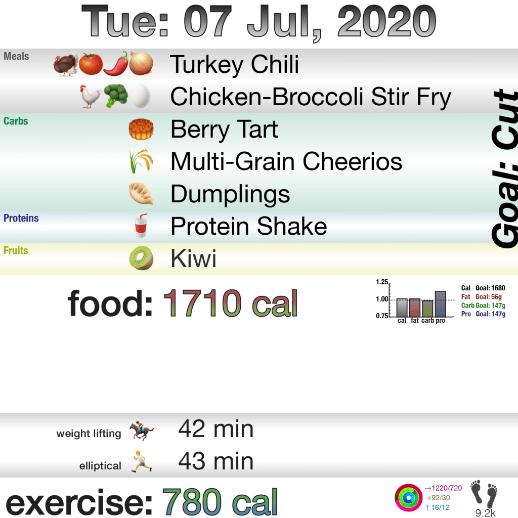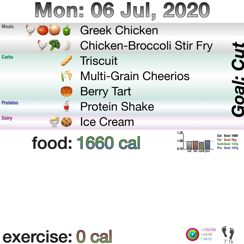 I didn’t really want to write yesterday’s blog, and going to bed close to 10pm helped not write it. The reason is that I didn’t exercise. I was fine on food, and I even filled my rings because my exercise on Sunday went well past midnight, but getting up late, work, and going to bed early was a simple excuse to avoid doing weights.
