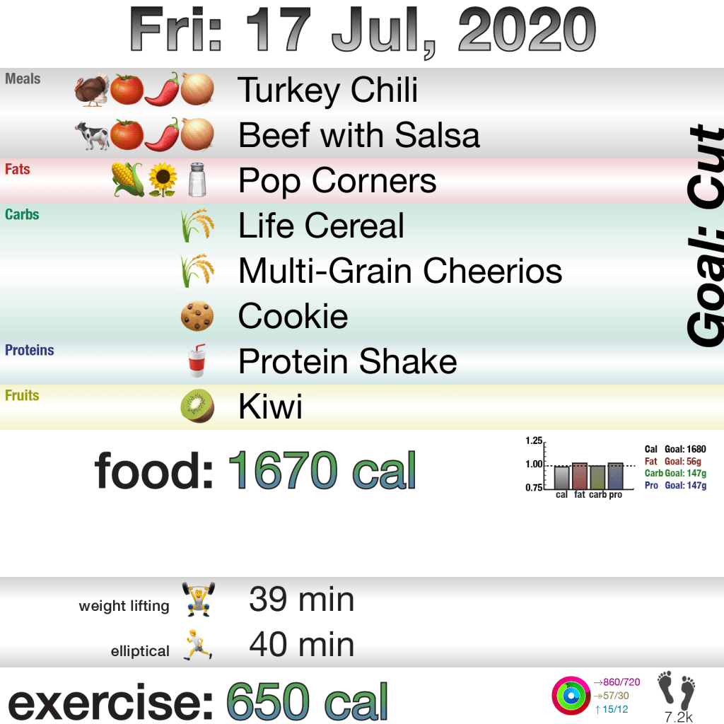 Food today was good, as it has been. And exercise today was good, doing both weights and the elliptical. So … that’s that? Oh, and I’m still really tired now. I’m not sure why. I’m going to try to increase the average sleep to 9 hrs and see if that does it. It might be the weights?