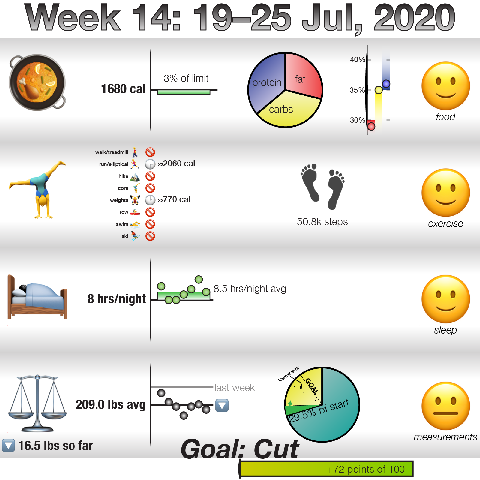 Looking Ahead 1 Week: Looking ahead for this coming week, I’d say I hope to make more progress, faster, on weight, progress on bodyfat percentage, sleep a bit more (I was less tired this week, so making progress there), maintain doing well on food, and exercise … exercise I hope will be more this coming week. I’m going to do another Apple Watch challenge with a friend, likely starting Monday, and it’d be nice to finally start to regularly get those core exercises in the morning in. I’d be happy with just 2. Happier with more.