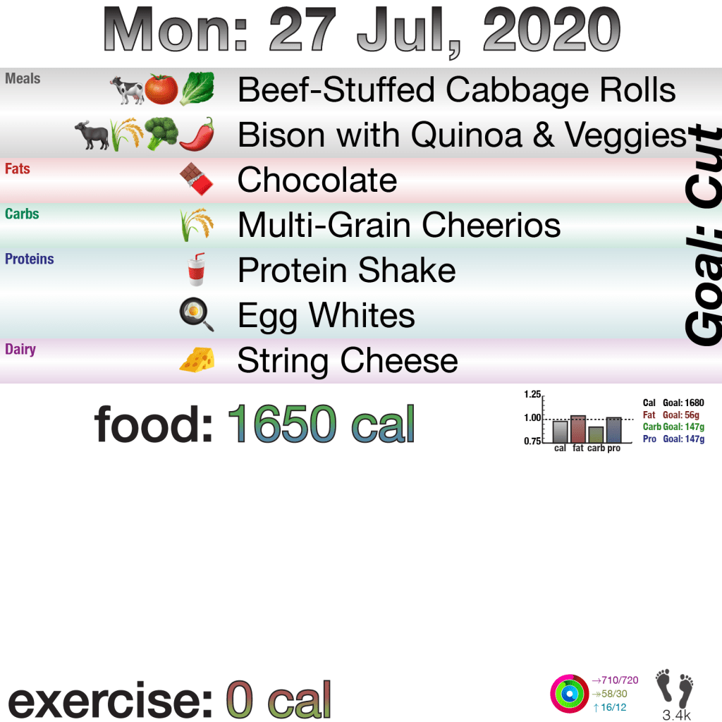 Monday was a lazy day in that, with all the stuff I had to do the last two weeks, I just had trouble getting the motivation to do much of anything. Be that work, or be that exercise. Also, with the fat in the meals, I had to dig deep into my roulette of protein sources for the lowest-fat option I had, egg whites, in order to get enough protein without going over on fat. I ended the day behind quite a bit for Day 1 for my Apple Watch challenge.