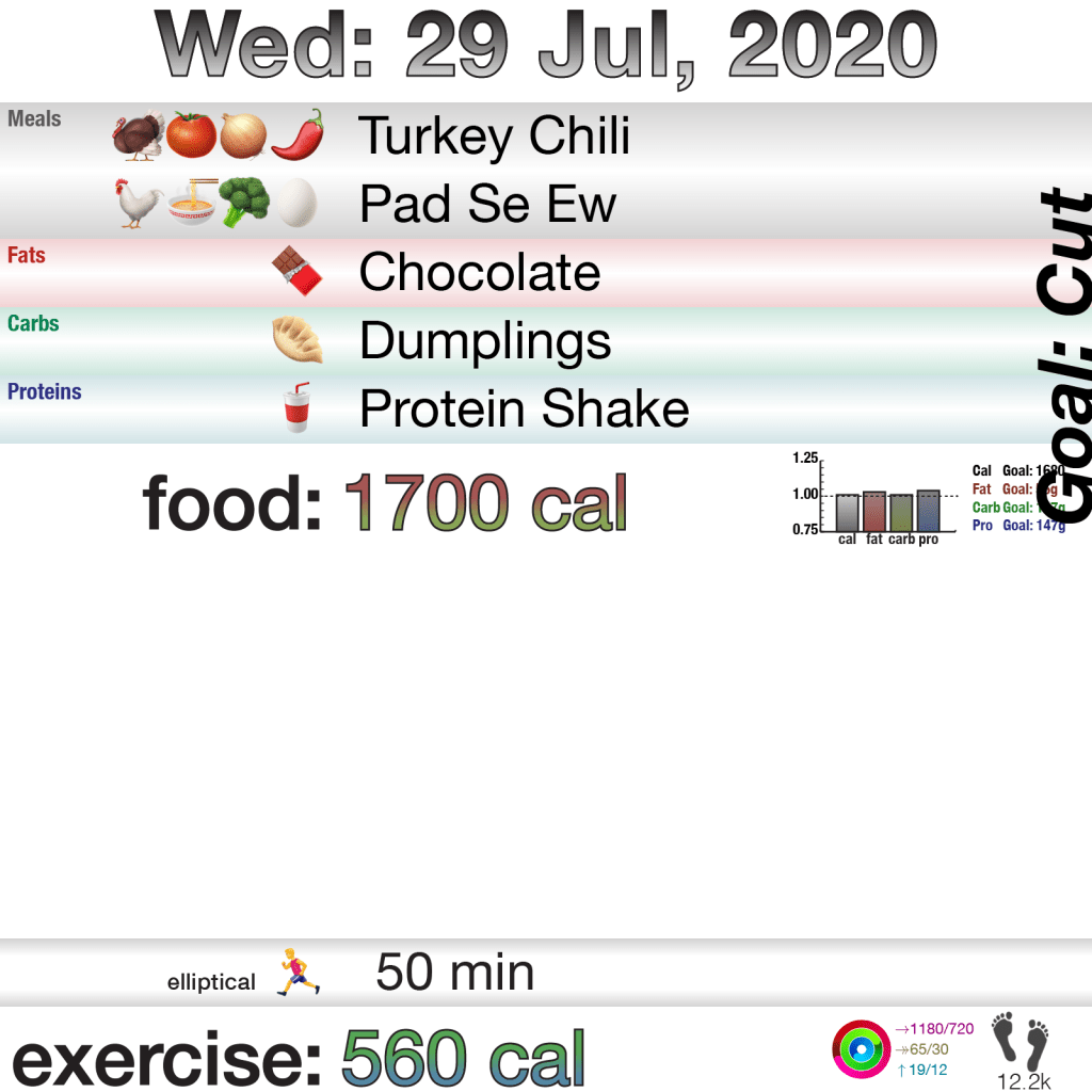 Today was slightly high on calories, but well within my ±5% tolerance. The main issue was that I added a pound of tofu to the pad se ew, but I hadn’t factored that in when planning the day/week, so by the time I did, that already made me go over.