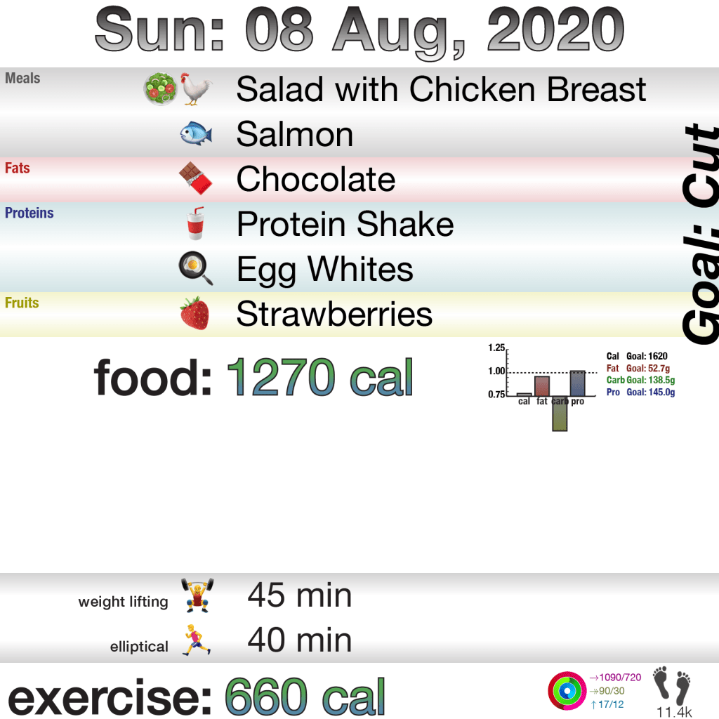 As usual for Saturday, a quick post: This is the last day of attempting to balance out food so I can end the week within my calorie goal (±5%) and macros. Also did weights yet again, and cardio, so, that’s something. Not feeling good about this week, as you’ll see in the next post. The rest of today was trying to catch up on sleep, and actually getting some real work done.