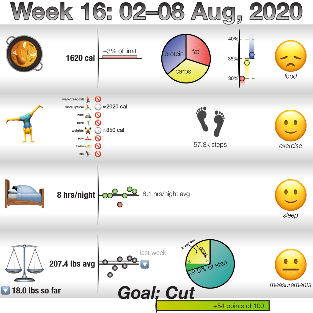 Measurements: And so because of the above, my measurements did not really improve this week. Yes, average weight went down, very slightly. But the trend was up this week, and my various tape measurements did not go down. Now, they didn’t go up, but they didn’t go down. I feel a bit like I’m reaching a self-imposed plateau that I very much need to power through, or I’ll risk losing motivation.