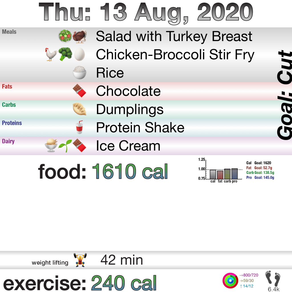 That in mind, I think I discovered something: My Excel spreadsheets for tracking food the last two weeks had a copy-paste formula wrong. Meaning there’s several hundred calories that were unaccounted for, and why I think I was gaining weight. So, this week is kinda a loss, but I’ll discuss that more tomorrow in the week-end wrap-up. I’ve accounted for it in my own tracking, but I’m not going to go back and update all the daily charts.