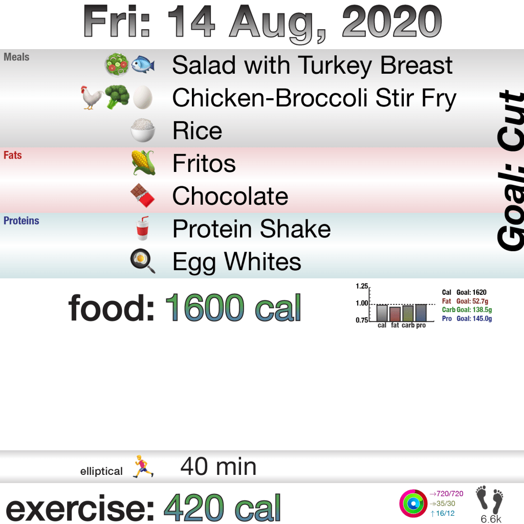 So, I got my calories in, got my protein in, stayed under my calories, and managed to get 40 minutes on the elliptical in. And, after 63.5 hrs of programming this week, I think I finally have my new stuff working and debugged, so I should be able to focus now on running it rather than programming it.