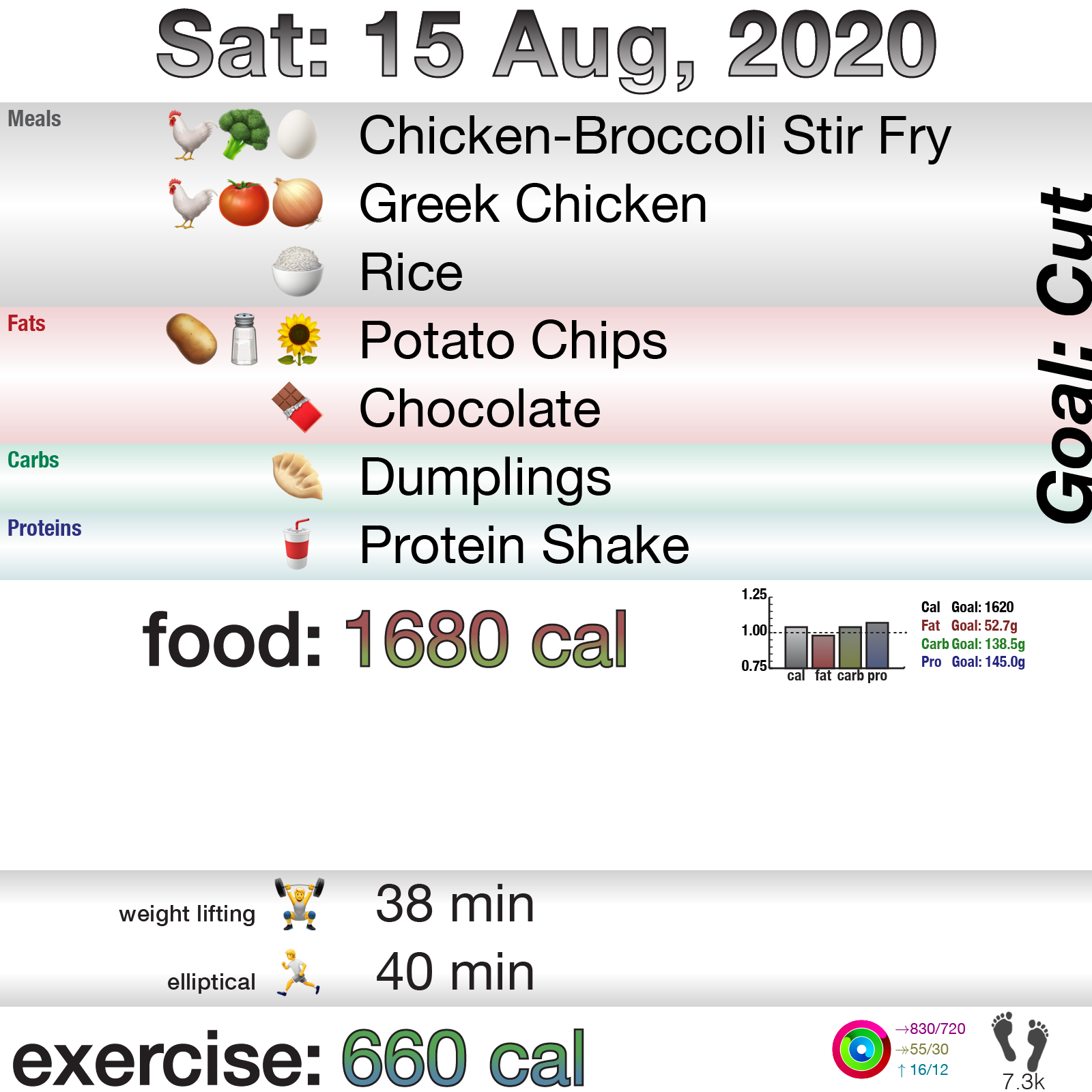 So … in brief, I over-ate a bit today, still was ≤5% of total calories, and same with hitting the macros. I did both weights and cardio today, and my weight is going back down now that I have the clerical error figured out.
