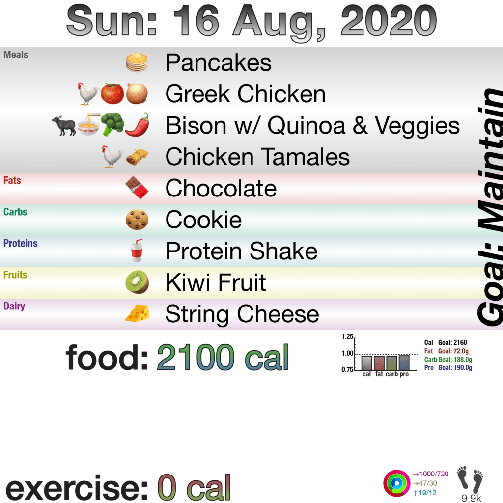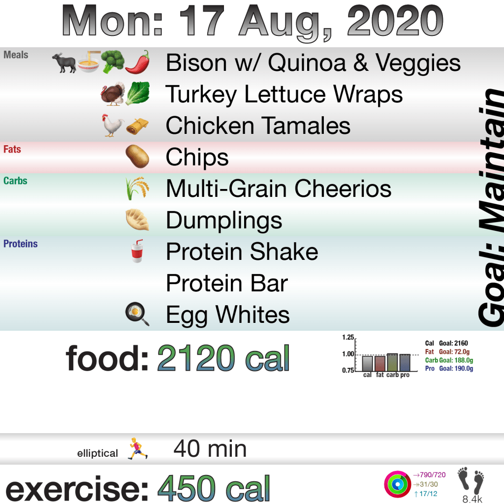 It’s the start of my Maintenance week (9th week out of every 9), so calories are up, food is up, and wow am I full! Sunday I took exercise off because I ended up curling up on the couch with the bf and watching TV for two hours before bed. But, I ate within the caloric limit, and that was after spending basically all day in the kitchen cooking (tamales take a lot of work!).