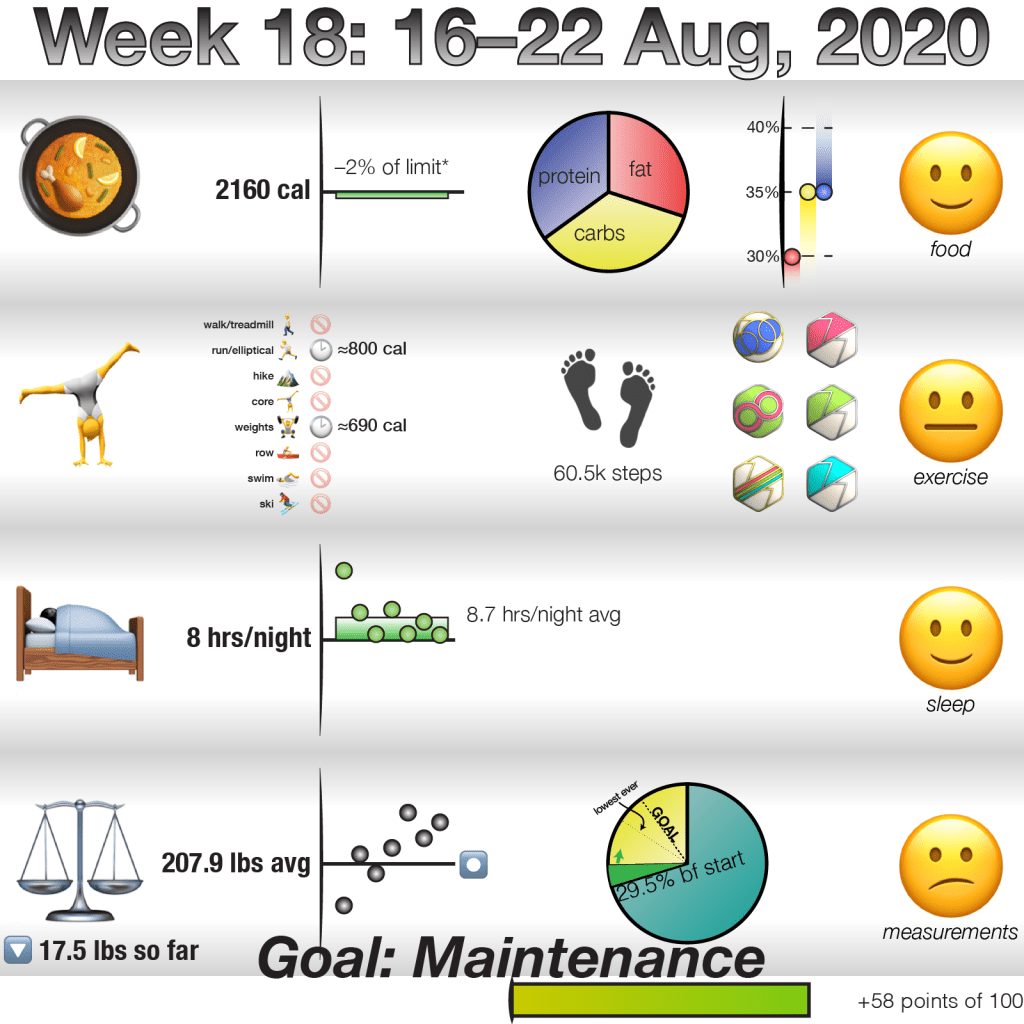 Exercise: For reasons already noted in the ≈daily update posts, this week was not very good for exercise. I did somehow have more steps this week than the previous two, and I’m not really sure how, but I’ll take it. But I skipped out on the elliptical twice, once for a headache and once for a stomach ache, and because I’ve been treating the ≥5×/week for cardio thing as more of a “limit” lately than a minimum, I didn’t have my free days stored up from earlier in the week. So, I’m going to try to break through that this week. Another issue has been leaving it to the very last minute (sometimes quite literally, starting at 11:59pm). I have tried this week to not plan out my work schedule, but just to lay down my cooking, sleeping, and exercise schedule. So I have in there doing the elliptical mid-afternoon, except weights days which will then be evening, but starting closer to 10 than 11:30. We shall see what happens … . That said, in the infographic I’ve decided to start (or, do, at least this week) putting up the badges I get on my Apple Watch to just demonstrate that, seriously, even though this is Week 18 of this fitness journey, it’s much better than the previous >1900 weeks of my life with respect to fitness. For instance, this is the 7th week in a row where I lifted weights 3×/week, almost on the same days. That hasn’t happened in years … like, not since the beginning of 2015. I also, starting last week, faded out the 🚫 symbol on exercises I didn’t do, so’s to avoid a giant wall of red. I should be proud of my accomplishments, remember that it’s okay to have setbacks, and what’s important is to pick myself up from that and move forward, not backward.