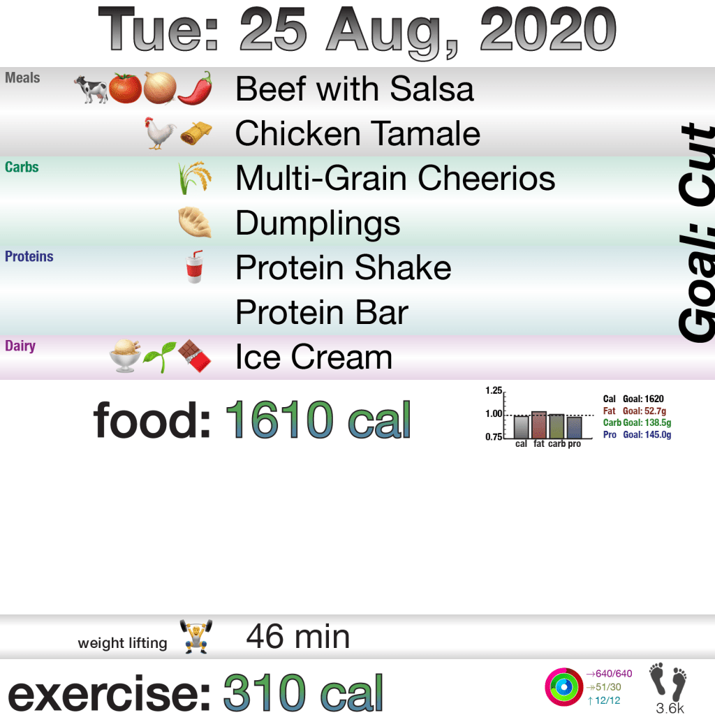 Which brings us to today, Tuesday. I have zero idea why I was so tired today, despite getting an hour more sleep. But I ended up working and napping, being too tired in the afternoon to do weights. I forced myself downstairs by 8pm (well, 8:30pm), but that was when DOMS from yesterday’s core exercises kicked in for some leg, shoulder, and back muscles. I got through weights okay, but I was so sore afterwards that I again couldn’t get up the energy to do cardio, meaning I’ll lose points this week for not doing it for 3 days (so far). It’s now been 5 days since I have done any cardio. In good news, my weight is dropping again, already 2 lbs since Saturday’s weight and I’m back to >20 lbs lost from my peak in April before I started. So, at least I have that going for me?