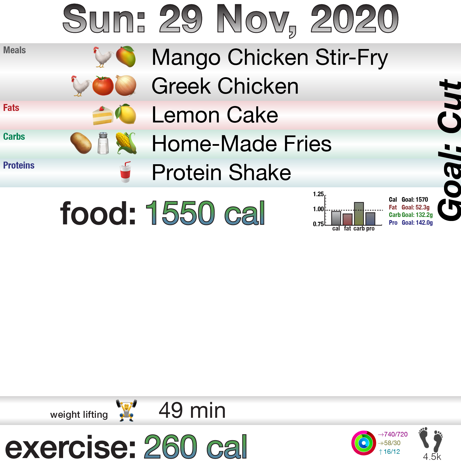 Food … I, again, almost cheated. I almost didn’t count the potatoes. But I then did, and cut out the cereal and almonds, and that got me within range for everything except carbs. The cake was left-over from last week and really needed to be eaten.