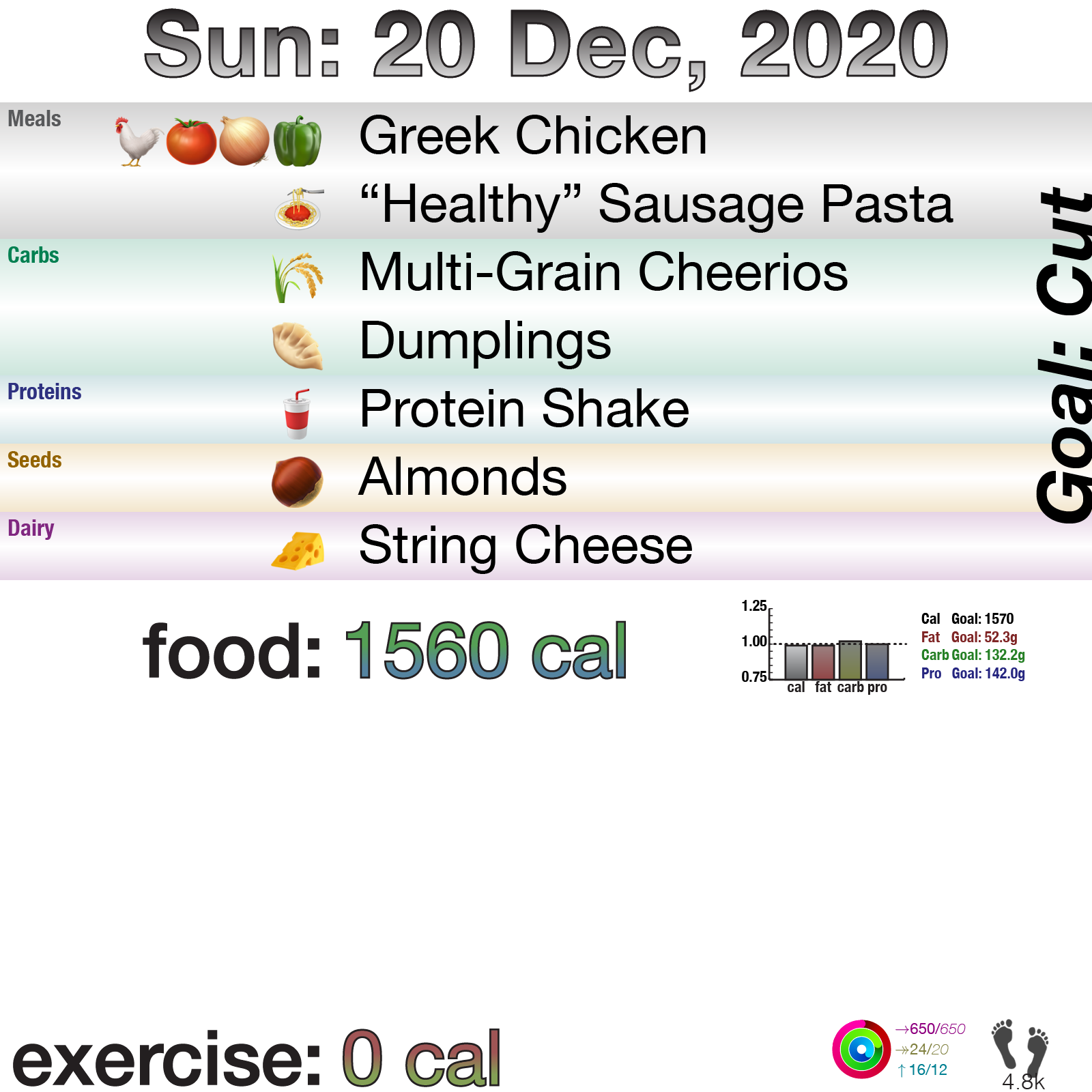 That out of the way, food-wise, I’ve done fairly well the last two days. I went a bit over on carbs yesterday because I wanted to try a new recipe I saw: eggnog snickerdoodle cookies. They were decent sugar cookies, even decent snickerdoodle cookies, but they do NOT taste like eggnog. Oh well.
