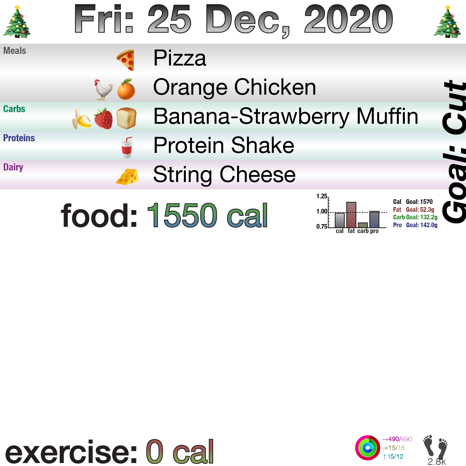 As noted in my last update, I planned to over-eat on Christmas Eve Day and compensated for that by planning to under-eat the next two days in order to meet my goals for the week, which I did. Christmas featured my left-over pizza, and then a new recipe for me: Orange Chicken.