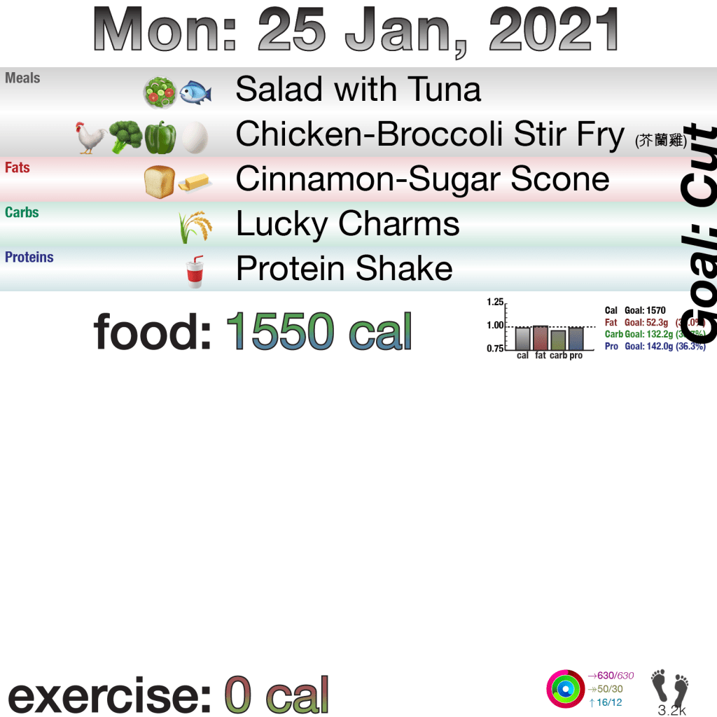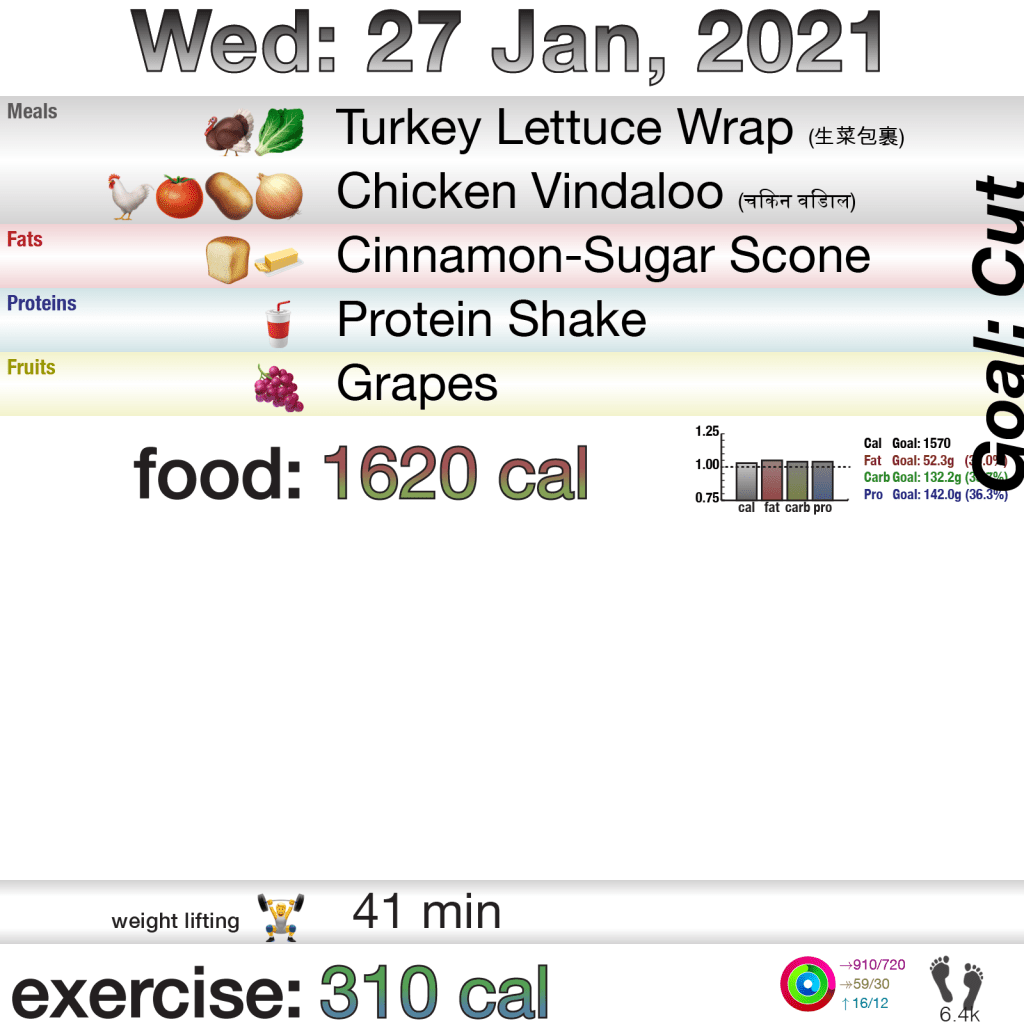 Let’s g’head and do a “daily” update for all the days this week, now that I got the infographics made. Some of this will be a bit of a repeat of the last post, but some new. I like this because it gives me a visual overview of what I did, and it certainly focuses on food given that weight is lost in the kitchen by PUTTING DOWN THE FORK!!
