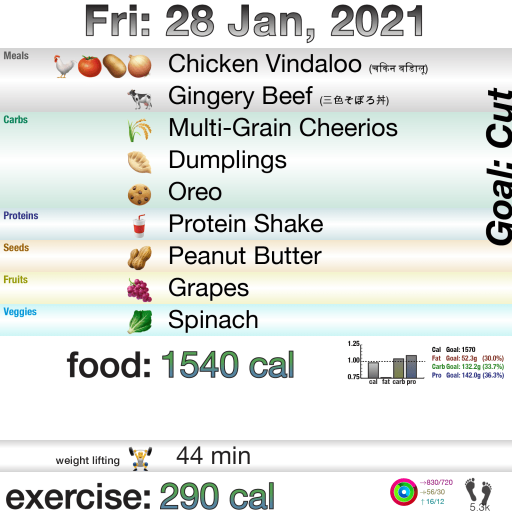 So … I managed to eat within my budget, did weights three times, cook four new things, and I’m starting to get my sleep schedule to something normal. Decent week.