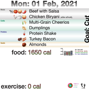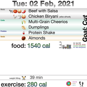 So, three updates above for the first three days of this week. I stuck fairly well with the food plan, needing to shift a few things as the days went on. I had left-overs Sunday and then made beef with salsa, which makes four servings and I’ll continue to eat through today, Wednesday. I made chicken biryani on Monday and that’s also something I’ll continue to eat through today, Wednesday. With two main meals set, that makes filling in the gaps a bit easier.