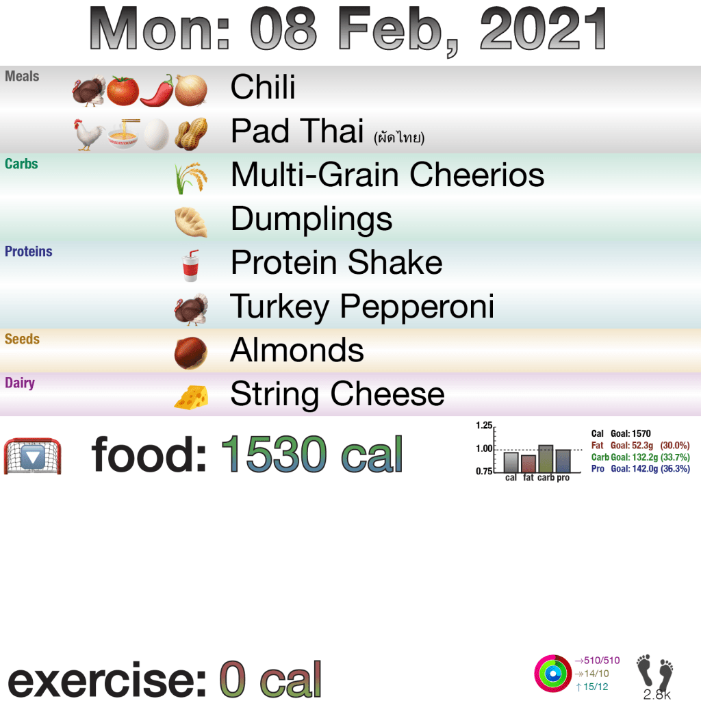 Regarding food, I’m still finding myself doing intermediate snacking on a sliver of dried mango here, a single M&M there, and needing to consciously stop myself from doing it. Fortunately, I’ll be out for several hours tomorrow, so it’ll be a bit easier not to do that. Also, I need to remember that I have pickles and ice pops for those “zero calorie” snacking craves that I need to exploit.