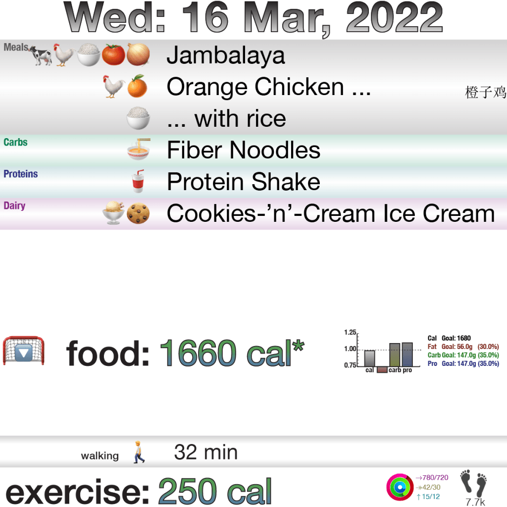 All that lovely planning said-‘n’-done, you might notice the asterisk next to calories today. That’s an indicator of a “forgiven” line item that I didn’t list. I very occasionally will do that if It’s a kinda minor thing and I just don’t want to count it. Cheating? Yes. Recorded in my sheet so I could always go back and put it in? Yes. Anyway, today’s was one of those caramel chocolates I mentioned and the bf wanted to get peanut butter -filled pretzels, so I noshed on a serving of those throughout the evening.