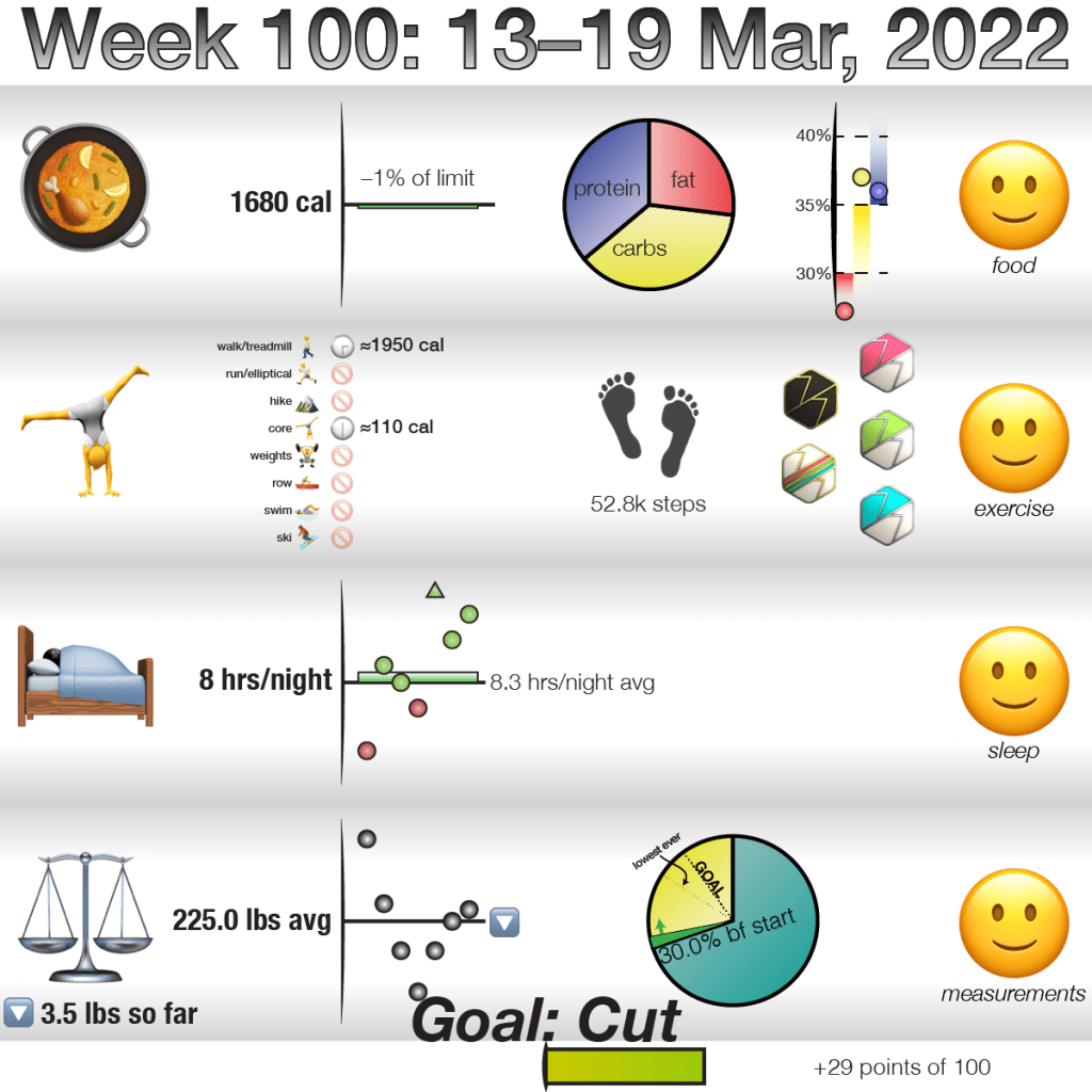 That explained, points this week were at 29, which isn’t great, but it establishes certainly a starting position. Before I added in the part about counting all food and not transferring it, my peak points in a given week were at 72, which I got for a few weeks around July 2020, where the only thing I was really missing was core exercises. Since I started “v2” with that in there, the lowest score was 9, and the highest 62 (April 2021). I stopped tracking for the last year, so I’m back now at “Week 100” and a score of 29 isn’t horrible and highlights areas to improve. I lost points this week for: Not getting ≥8 hrs of sleep each night, not counting every bit of food, not meeting the calorie/macro goals every day, missing 5 days of core exercises, missing 3 days of weights, and missing 1 day of not getting to at least 40 minutes of cardio.