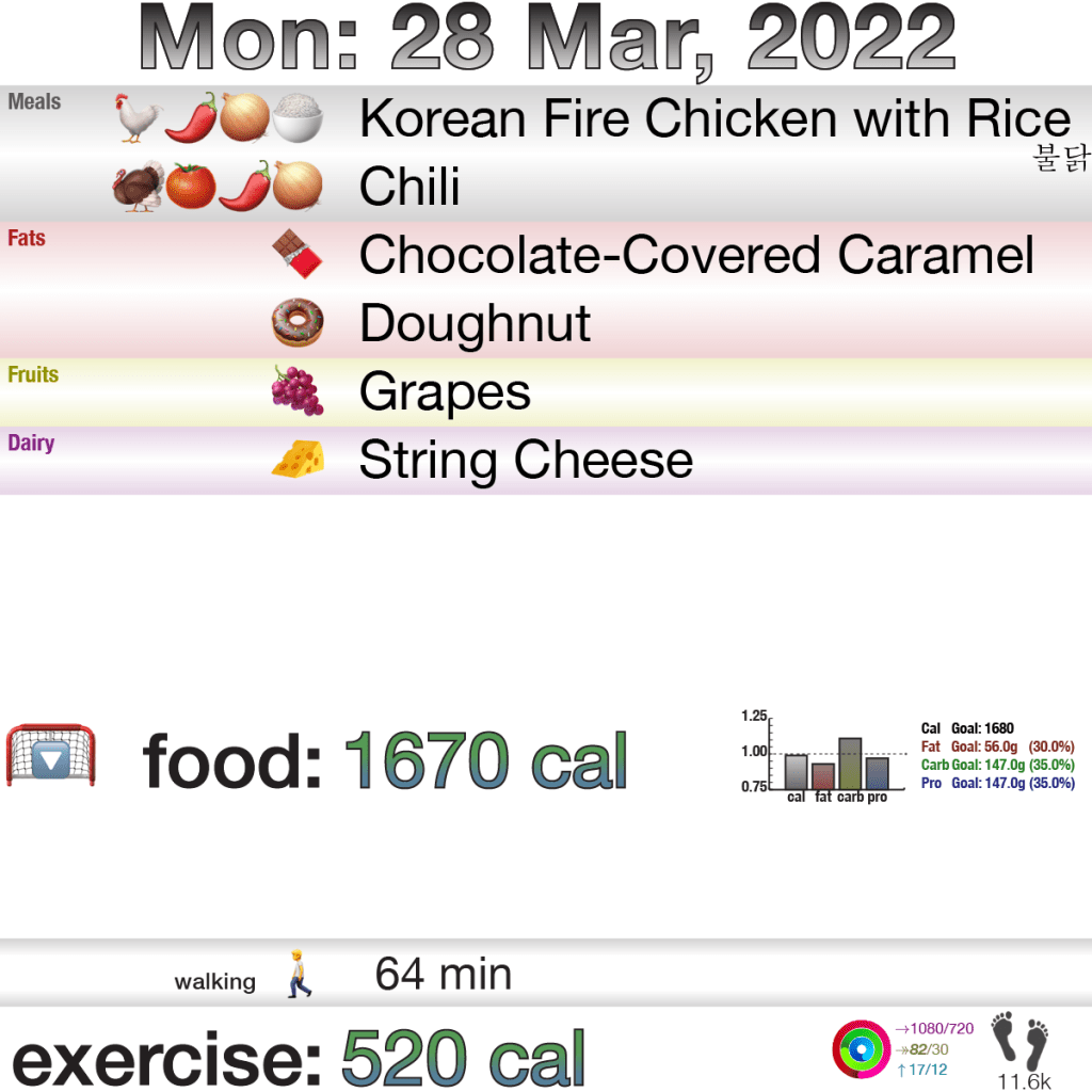 So, going through Sunday, it was an okay day with respect to fitness; not great, but okay. Food was carefully planned, I was a non-trivial 7% (okay, maybe trivial) below my calories, and I even was able to fit in gummy bears.