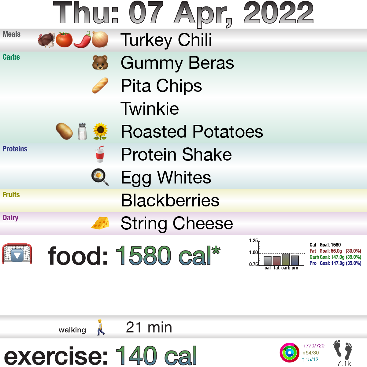 Writing this a day late, I’ll just note that most things went according to plan: A full day out running errands and going to the dentist (no issues!), going to the store, walking before the dentist while the bf swam, etc. Didn’t exercise nearly as much as I would hope, but I did get all the rings filled legit-like. There’s an asterisk next to calories today because we got a few things at the grocery store to try out of pure interest, like the bf wanted to try twinkies again after a decade or two, and I wanted to try pita chips, or we got blackberries again at Costco. Problem is, there were several little nibbles here-and-there and while I tried to account for them, I am certain that some things did not get counted, so I lose points on that.