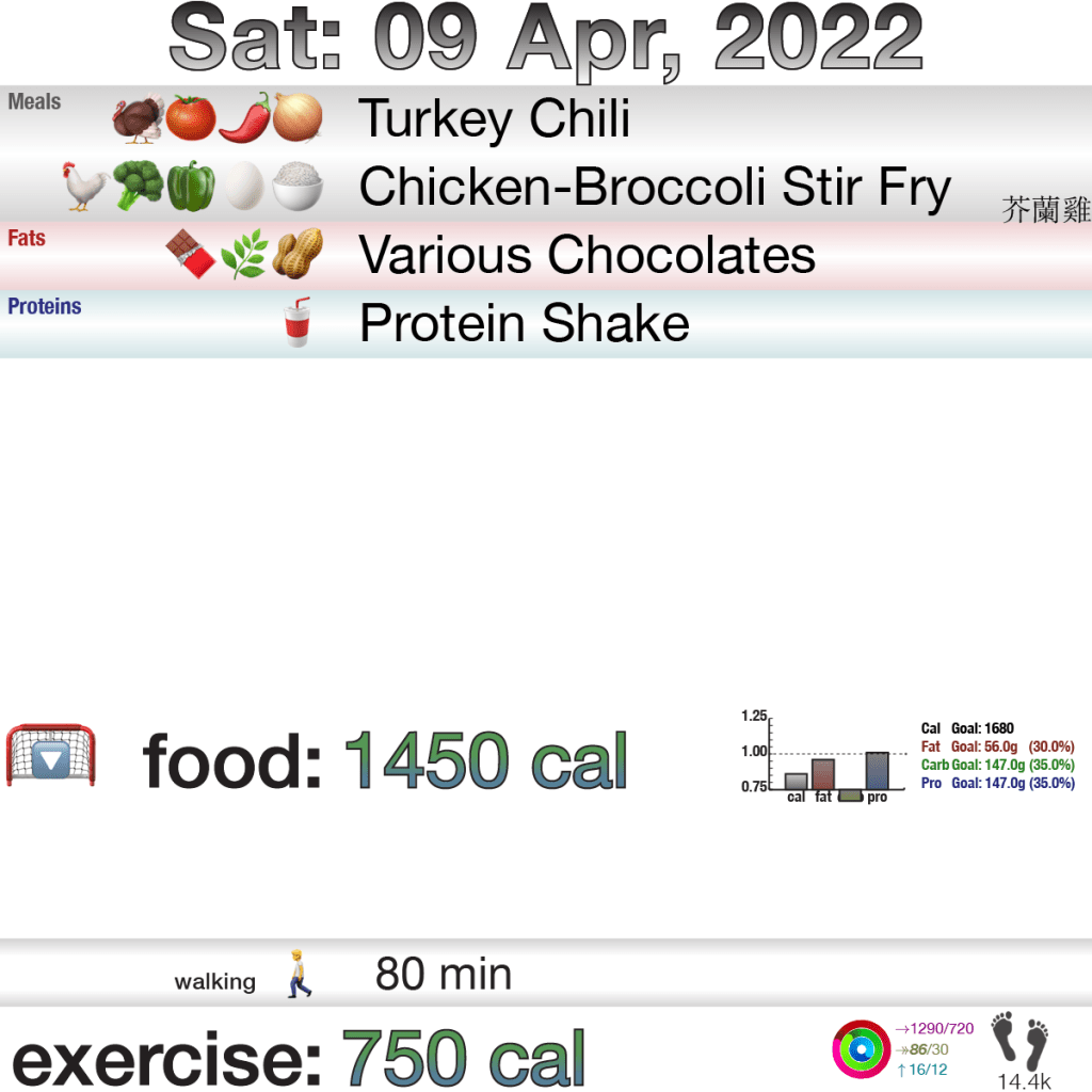 We ordered some chocolate from a company we like, and it was supposed to arrive Friday. FedEx decided they didn’t want to deliver to us and ended up delaying a day. So, 28 lbs of chocolate later, about 50,200 calories, and Saturday’s eating included a lot of “various chocolates.” Ensuring I count these will be important over the coming weeks since it is so easy to wander into the pantry and grab one and not think twice about it.