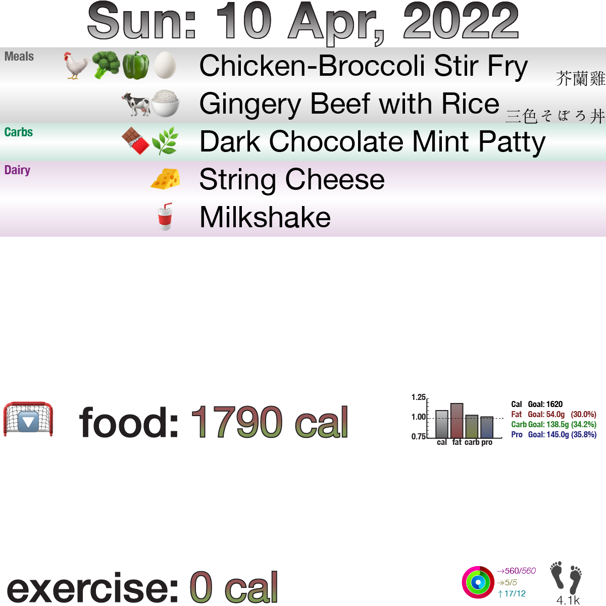 Sunday afternoon, I had looked at my meal tracker and I saw I had a lot of calories open, so I offered to make the bf and I a milkshake, or “thick shake” in some countries: It’s milk, cream, ice, sugar, and flavoring, as opposed to ice cream and milk. Since we had all that chocolate I noted from last week, I suggested we try putting in some of the peanut butter chocolates and see what that was like. It wasn’t great, and then I did the calories, and … wow. That sucker was 600 cals for a glass, with more than 70% of my fat for the day and a third of my carbs. So, that wasn’t good. But, I managed to actually not snack beyond that and so, while calories were a bit up, it wasn’t crazy. Because of all the protein in the stir fry leftovers, I didn’t need to do a protein shake to get to my protein goals.
