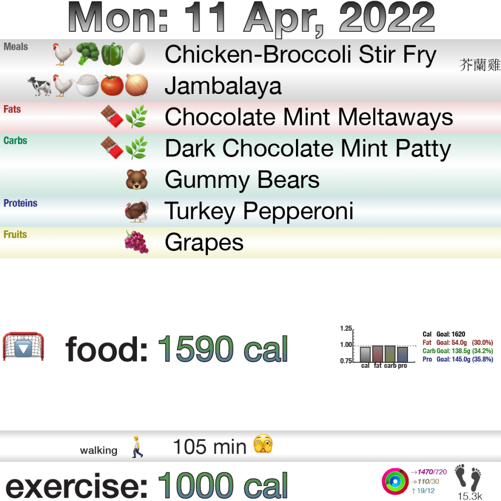 So, let’s talk about exercise. Sunday was crap, the third day in several weeks where I did nothing (March 29, April 5 were the other two days since March 13). Not bad as a trend, but I had to lower the goals to meet my rings … I again don’t really consider that cheating (well, it is if “cheating” is a binary thing) this time because of the crazy-amount of exercise from Saturday doing most of The Loop.