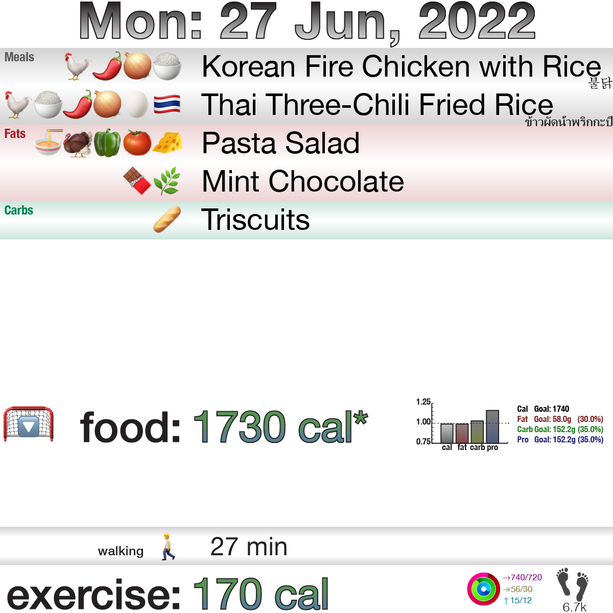Food-wise, there is an asterisk next to the calories … I stress-ate a bit but I’m not counting it (but am noting it as an asterisk) I have it tracked, just not in the total, so I can always go back and include it at some point later or for posterity to future generations in 700 years. For the record, I had a few gummi bears and an extra serving of the pasta salad. And when I don’t include something, I do include anything good about it: All of the micronutrients, the protein, and fiber. Leaving out those pesky other things like fat and calories and carbs. That said, writing this in the future (today, the 28th), I can say my weight is down, so … yay.