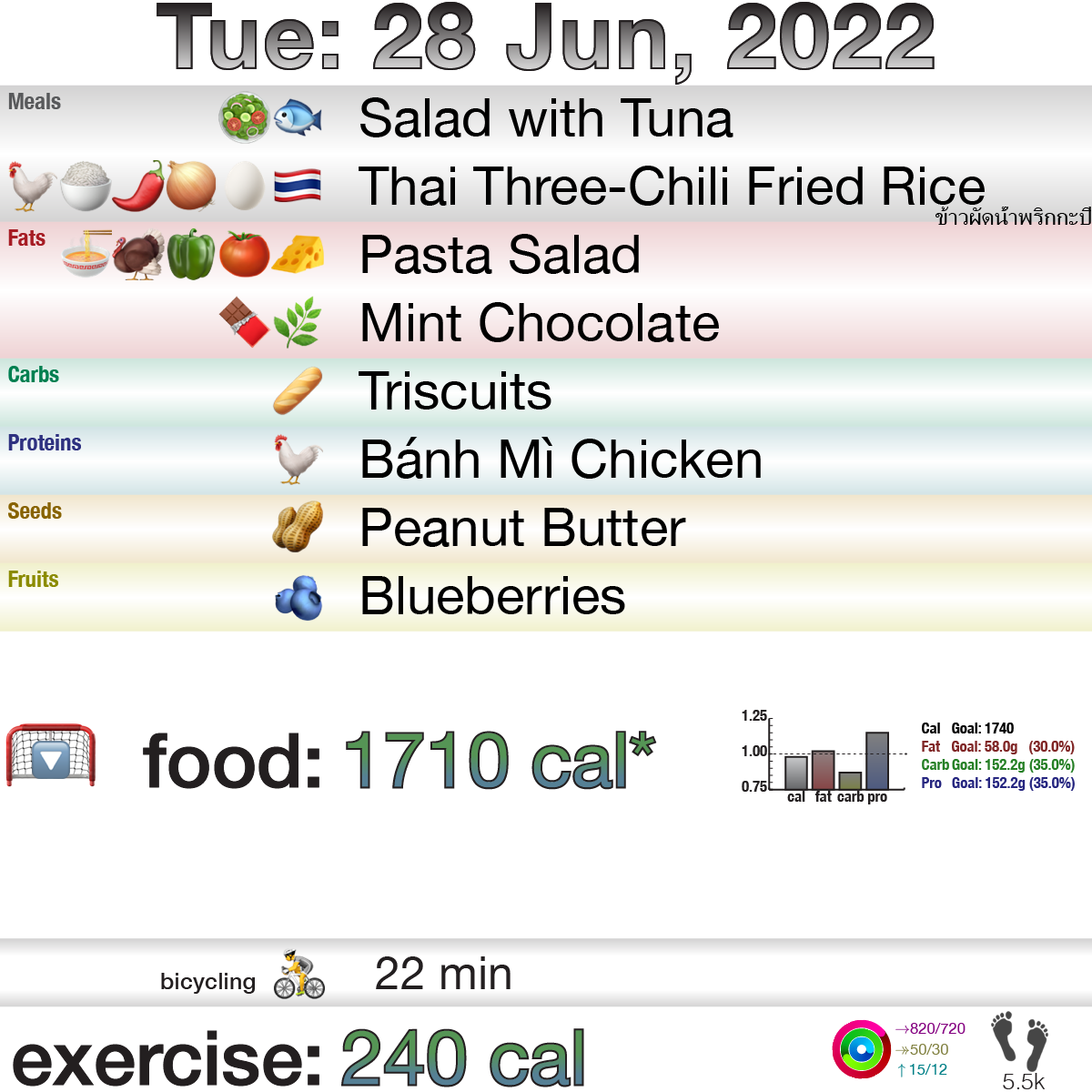 Otherwise, food was pretty well done today. I think the Thai three-chili fried rice might make it into my regular rotation of, “When the boyfriend wants fish or steak, this is what you can make.” Though it needs a bit more soy sauce. That aside, the only thing new on the food is the chicken I mentioned I prepped and set aside on Sunday that would normally go in a wrap, but I just have in the ‘fridge to eat. And I figured I was good on carbs today so I should start eating the blueberries that are 10 days old.