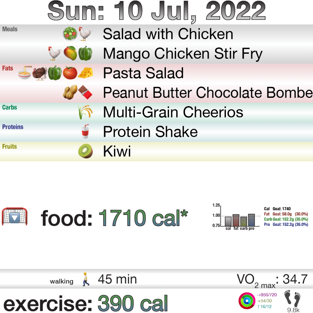 Anyway, that’s a good way to start the week. I also motivated myself a bit by doing another “fantasy” thing, but this time imagining what my weekly summary infographic would look like if I were actually doing everything I want to in a week, like a perfect +100 points, like doing all the exercise I want and hitting 4000 calories expended per week, etc. I think that helped me with motivation for a walk today.