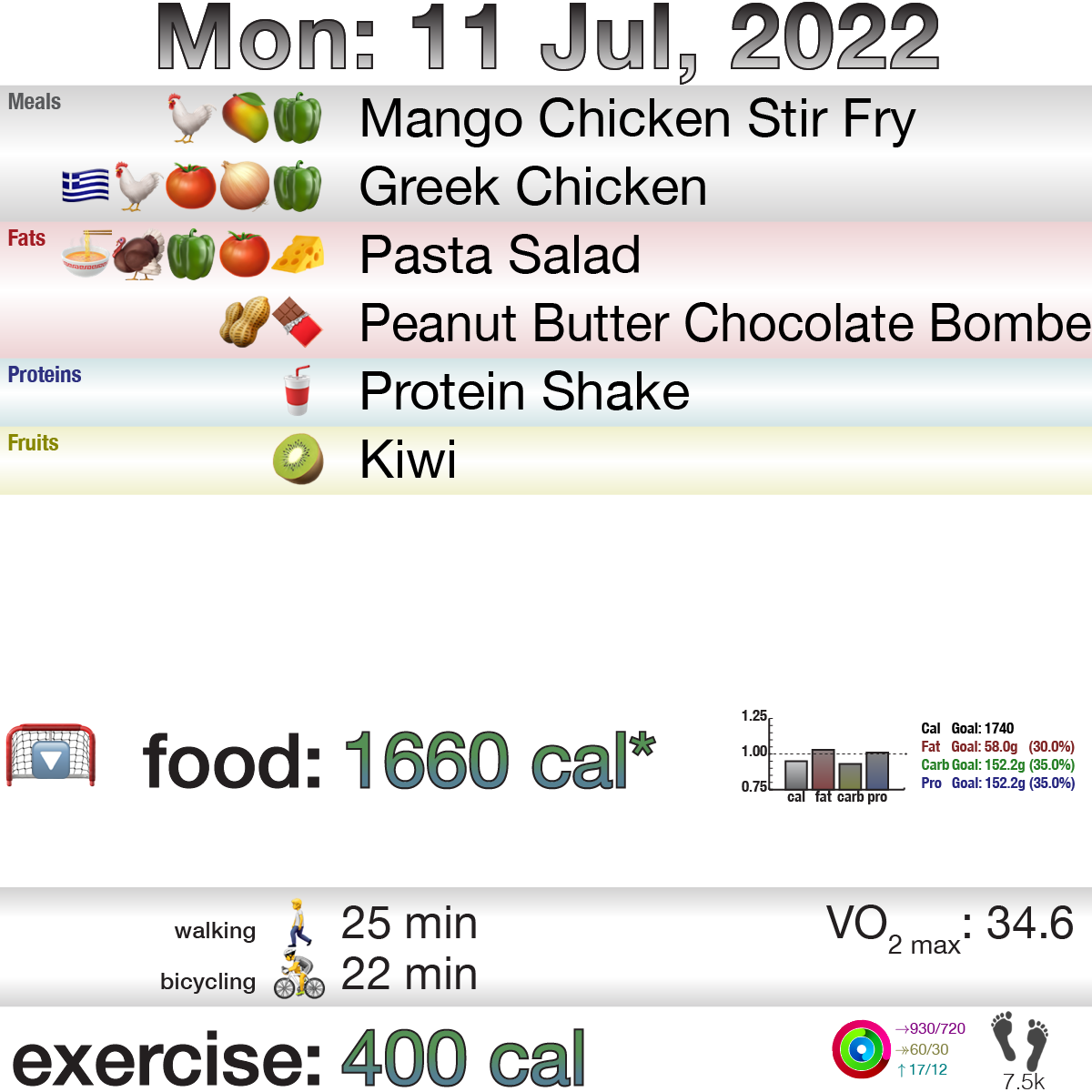 Short post tonight … food today was just as good as yesterday with cheating on the second half of the peanut butter chocolate bombe. Exercise, on the other hand, was good. It was actually somewhat cool (if humid) and overcast, so I actually put the bike in the car and went down and rode. I was still crazy-out-of-breathe this time, but it was very slightly easier than last time, and certainly easier than the time before that. So, yay. And, I walked again tonight, but the VO2 max was very slightly lower.