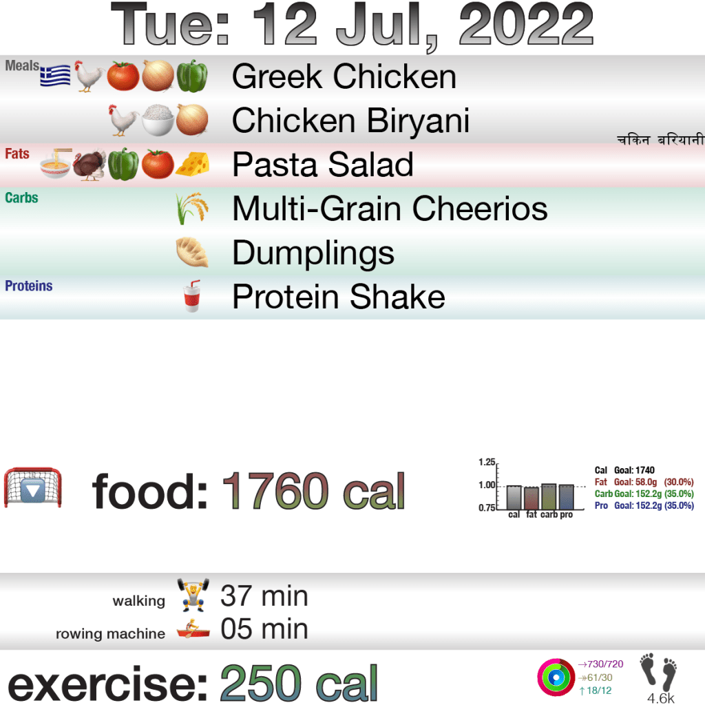Regarding exercise, I came very, very close to not doing anything. I was still suffering from DOMS (Delayed Onset Muscle Soreness) thru early evening, and my arms still hurt late into the night. And, it got really hot outside. But, I sucked it up and went down to the basement and I even did a 5-minute warmup on the rowing machine. I did that for two reasons: First, I was hoping to loosen up, decrease DOMS, and use it as a bit of a stretch; and second, I had an eye on my Watch rings and knew that I would never fill the move ring if I just did weights. I had also already decided I wasn’t really going to do cardio today. So … that’s that.