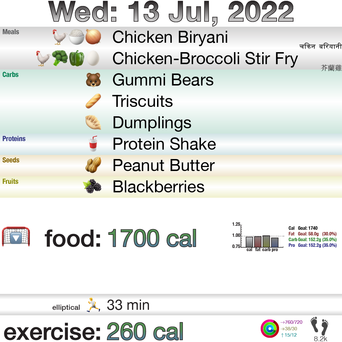 Food was fine today, lots of little things because I’m out of those chocolate peanut butter bombes. I had steadily lower and lower motivation to do any exercise today until around 10:30pm, and then I decided that low motivation wasn’t worth it or a good reason to stop my streak, so, I headed down to the basement and got on the elliptical. Granted, I stopped right after I closed my move ring, but at least I did stuff!
