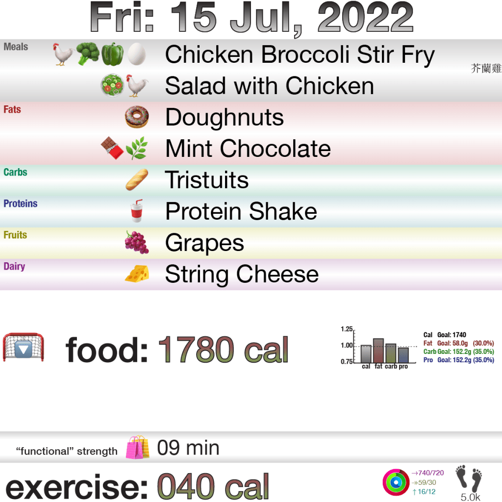 It was a day I went into work, so I had Friday doughnuts, which I had planned for. I did my grocery shopping, and I counted unloading and putting away the heavy items as exercise (hence the bags in the infographic). I had zero motivation the rest of the day to exercise, and that was after a 2.5-hr nap because I got about 6 hrs of sleep the night before. Instead, I watched a TV show for hours and went to bed at 4am.
