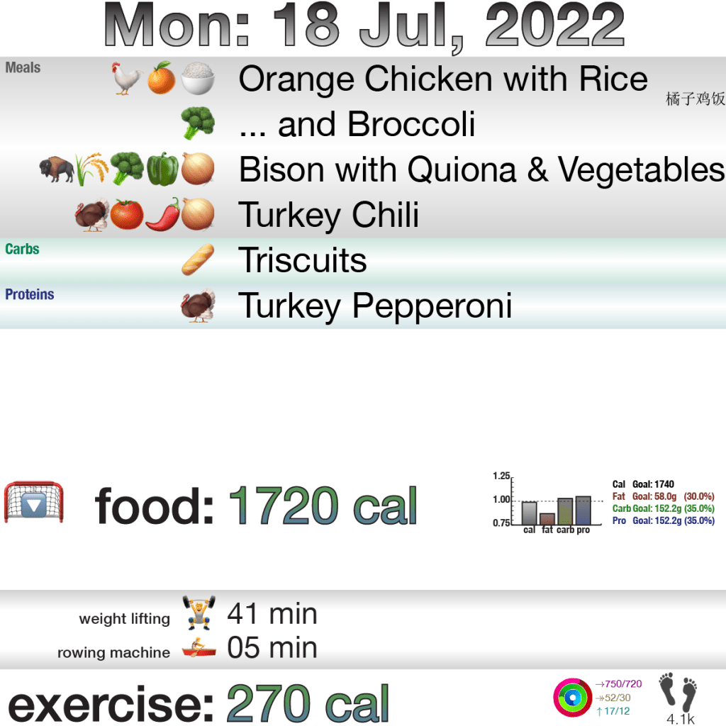 So, I didn’t. With food very close to yesterday’s, I was again low on fat, but I can afford that. However, I was working on the photos for input into the photomosaic code from 9 to 9, so I didn’t get down to the basement until about 9:30, so I did just do the bare minimum with exercise: 5 minute warm-up on the rower (with a new record on speed), and then weights, where I finally have started to increase the weight back up to what I was. Granted, it was just 70 → 90 lbs for most things, but I plan to keep going up every time now until I at least get close to where I was, or hit some significant form failure.