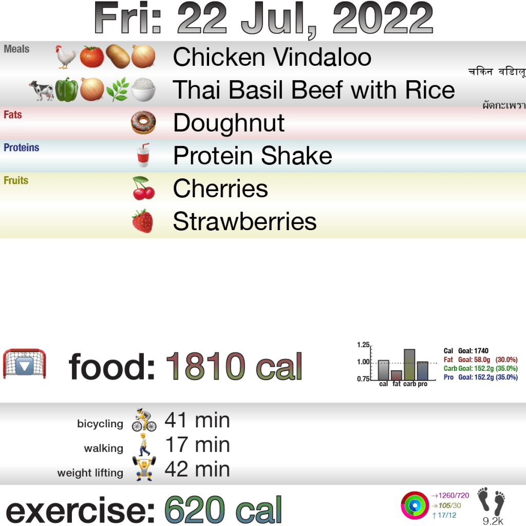 And, I stepped outside 10 minutes before sunset and it wasn’t insanely hot (or my threshold has moved), so I got in another 16 minutes for a walk. And then an hour later went to the basement to lift weights to get that in. Three forms of exercise today, and 620 calories burned from it. Yay!