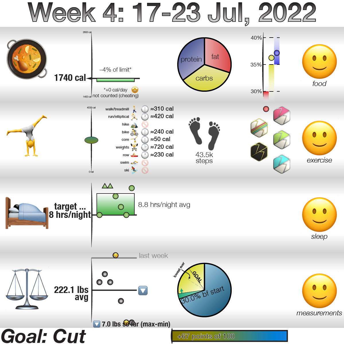 Measurements: The easy metric is that this was a good week for bodyfat percentage, where I am down and ahead of my goal. Though it is well within the noise still and I think I might’ve been sucking it in a bit when measuring my stomach. But, I was also down overall on weight, which is good. Though weight this week was a bit weird and had a huge range of 2.5 lbs, putting it on par with the first week. This was the first week where my weight fluctuated to above the previous week’s average, which was disappointing. That was the weigh-in the day after I didn’t do any exercise, so I suspected it would happen, but it was still disappointing to see. I tried hard the next two days and the weight plummeted. While I thought Friday’s weigh-in was cheating a bit (I’d been up for 3 hrs and had biked and sweat for 45 minutes), the same measurement Saturday morning for weight was nice to see. That said, I’m growing more behind in my average weekly weight vs my goal weight. Last week, the difference was +0.4 lbs, this week it’s +0.8 lbs. However, if I do a –0.725% of my weight per week from my initial high on June 26, and project out what the weight should be every day, I’m below (ahead of) that goal. If I change it to –0.800%, I’m exactly at my goal. The issue is the averages. So, we’ll see what happens. I’m not concerned yet, but I may have to adjust my goal. And let’s face it: Losing a little over 1 lb per week isn’t bad, it’s great. It’s just not as aggressive as I’d hoped. And, it’s hard to make a meaningful trend from four weeks with something like this. [Edit: Actually, I’m going to go ahead and modify the goal to be –0.700% of my weight per week, which moves my goal out an extra week, to be more realistic based on how I’ve been going.]