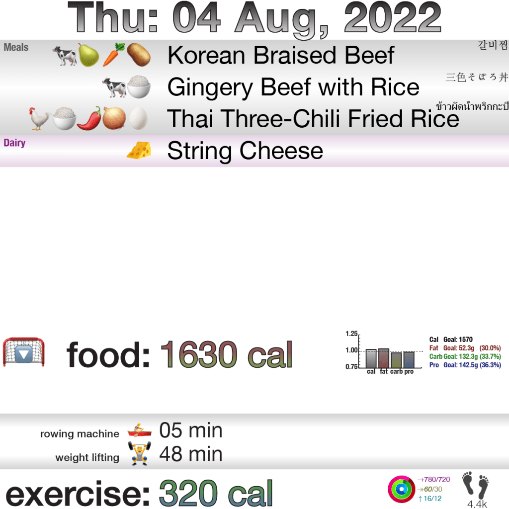 Given everything else going on today, I opted to use my second freebee and go light on cardio, doing just the five-minute rower warmup before weights. The boyfriend is going swimming again tomorrow morning so I’ll be walking for an hour, and we have cooler weather coming Saturday so I’m going to drive down to the mailboxes and bike, so I should be okay for the week with respect to cardio. As with last week, I did weights yesterday, today, and I’ll do the third one on Saturday.