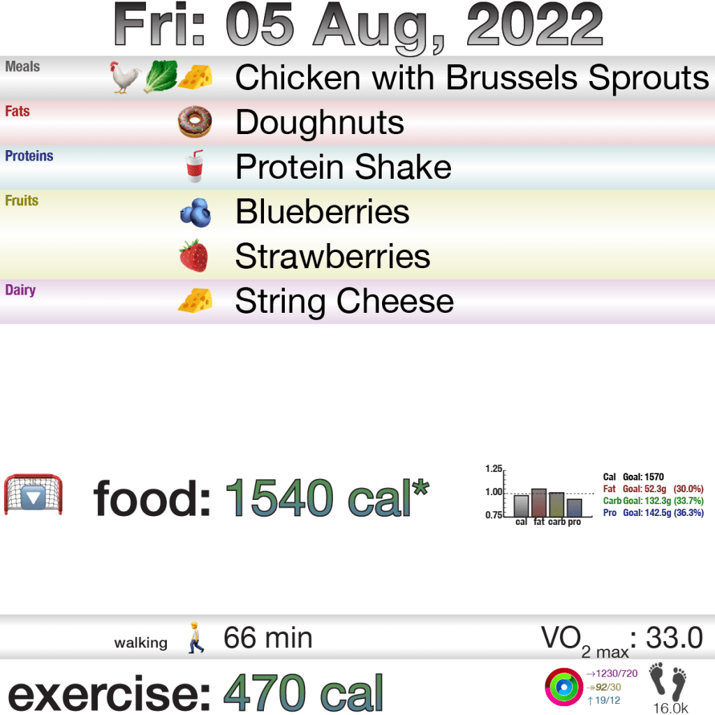 Walked while the bf swam, and VO2 max finally went up. Probably because I was record-fast for pace at 9.83 min/km while my heart rate stayed level. Food was fine despite the doughnuts. I did cheat slightly with finishing off some chocolates from two weeks ago, hence the asterisk.