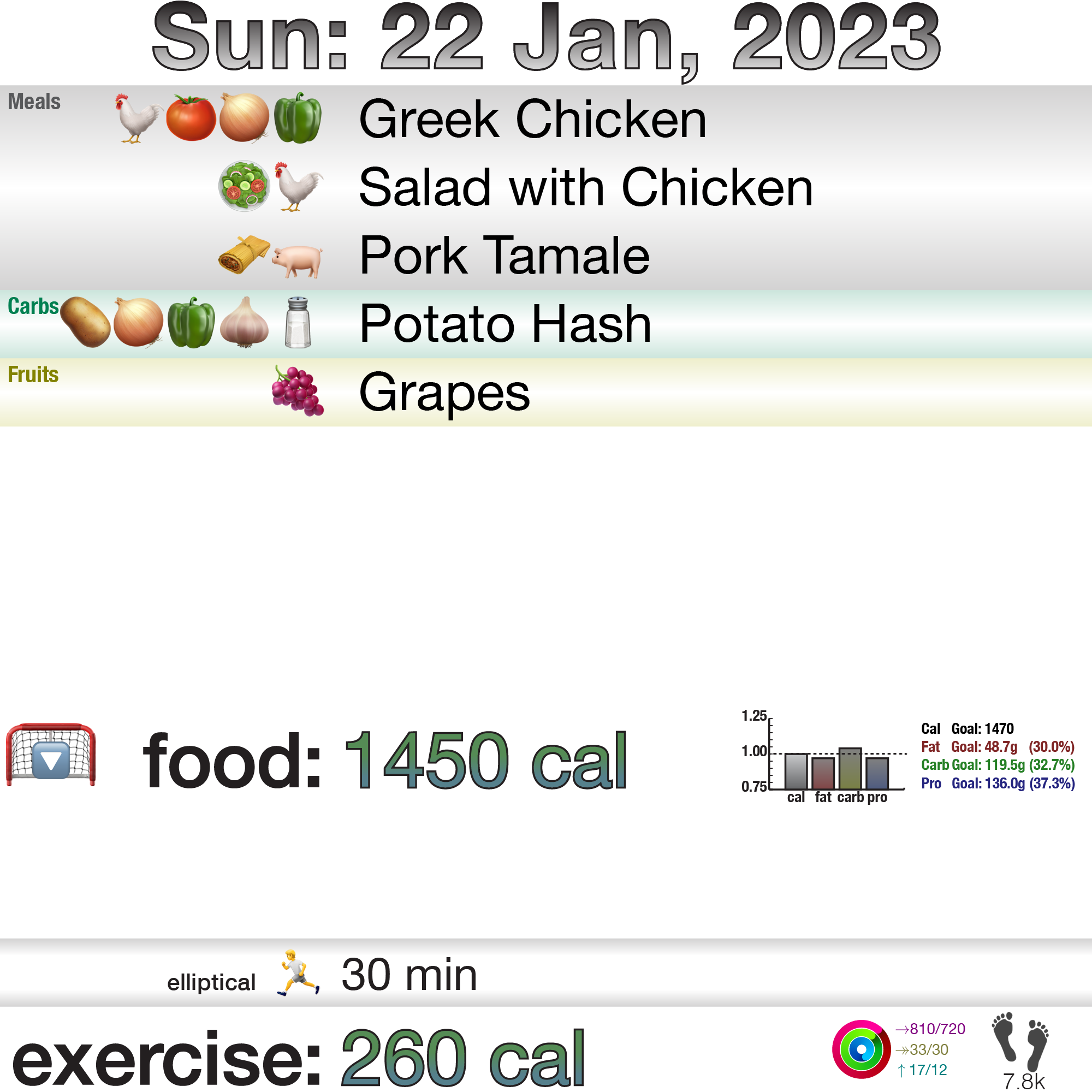 Food went very well today, I kept snacking to a bare minimum with a few grapes here-and-there, and I did the elliptical … in the morning!! However, the intensity was way down. I have been using “Level 7” on this elliptical since I re-started at the beginning of the month (this blog is called “Yet Again Fitness” for a reason!), but I had to go down to Level 4 and my heart rate was still a bit higher than normal. I had intended to do a second workout, but I decided I would stick with what I did and let my body recover for a day. And, writing this the next day, on Monday, I can say that the elliptical in the morning was back to Level 7 and there were no issues.